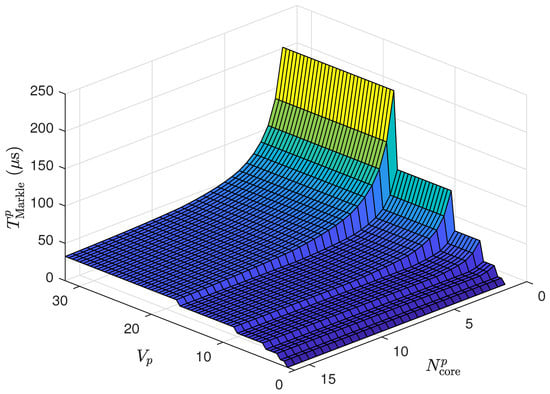 Table 5 illustrates the computation times (in s) required for updating Merkle tree structures under varying configurations. Each configuration is defined by the number of processing cores available, , and the number of sensors, , of each IoT device. The computation time is calculated based on Equation (38), which necessitates that each level of the tree must be completed before the next can begin. This table presents results for values of 1 and 16 across different numbers of sensors, showing how parallel processing capabilities can significantly impact performance. The value indicates the base time to compute a single hash (associated with p-th device) and is expressed in nanoseconds (see Table 1). The data demonstrate how increasing the number of cores can decrease the time needed to update the Merkle tree, enhancing the system’s overall efficiency and responsiveness in a blockchain network.