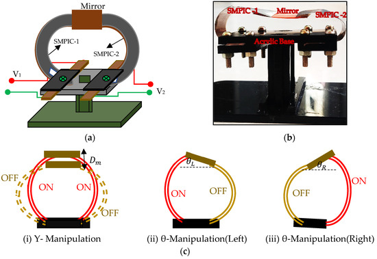 The SMPICs were activated by applying voltage on the pair of copper leads, which was directly in contact with the conductive SMA layer using the joule heating method. Depending on the amount of electrical current passing through the conductive SMA layer, the position of the mirror changed in the out-of-plane motion due to the deflection (unfold motion) of the SMPICs. When voltage was removed, the SMPICs returned to their normal state due to the bias force of the trained polyimide sheet. The manipulator could move the mirror in both the vertical (Y manipulation) and angular (θ manipulation) directions based on the actuate configuration of both SMPICs. The mirror could move in the vertical and angular directions depending on the three types of actuating configurations. One type is for vertical displacement, and two types are for angular displacement. In the first type, both of the SMPICs were activated simultaneously; hence, the mirror moved vertically (. In the second and third types, either of the SMPICs was actuated to move the mirror in the angular directions, i.e., SMPIC-1 was actuated and SMPIC-2 was not, to move the mirror toward the left angle direction (). Similarly, SMPIC-2 was activated and SMPIC-1 is not to move the mirror toward a right angle direction (). The dimensions of the SMPICs and the mirror are given in Table 1.