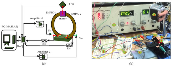 Experimental setup to actuate the mirror manipulator. (a) Schematic representation. (b) Photograph: 1. Power supply, 2. Laser Displacement Sensor, 3. Amplifier circuits, 4. DAQ, 5. SMPIC-1, 6. Mirror, and 7. SMPIC-2.