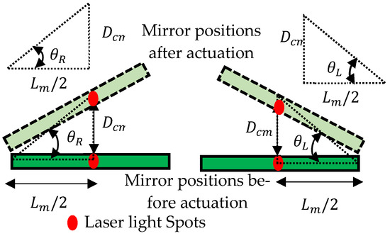 Equation (5) gives the relationship between the vertical displacement and the angular displacement of the mirror, i.e., the equation was used to estimate angular displacement using vertical displacement of the mirror.