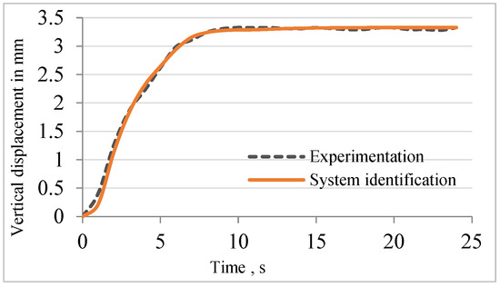 Using the experimental data obtained from the open-loop test, a second-order transfer function with time delay was developed to relate the input voltage to the vertical displacement of the mirror. Equation (4) provides the transfer function between the vertical displacement of the mirror and the input voltage. Figure 5 shows the responses for the system identification and experimentation. The Final Prediction Error (FPE), Mean Square Error (MSE), and Fit Percentage of System Identification came out to 0.00022, 0.00016, and 97.09, respectively.