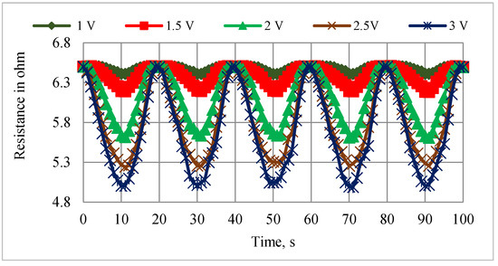 The relationship between the vertical and angular displacements influenced by the resistance variation of SMPICs was investigated through experimentation results. The SMPICs were activated with a slow input frequency sine wave signal to obtain the maximum possible displacement. The tests were conducted under different magnitudes of input voltages (1 V, 1.5 V, 2 V, 2.5 V, and 3 V). The data on the SMPIC resistance variation, both the vertical and angular displacements of the mirror, were collected at the rate of 1 sample per second for a total time of 100 s (5 cycles) for a given sine wave input of 0.05 Hz frequency, as shown in Figure 6, Figure 7 and Figure 8. The relationship between the resistance of the SMPIC and the vertical displacement of the mirror, as well as the resistance of the SMPIC and the angular displacement of the mirror, are shown in Figure 9, and it reveals has no hysteresis. Hence, it was possible to obtain the vertical and angular displacements of the mirror by using the resistance changes of the SMPICs when actuated.