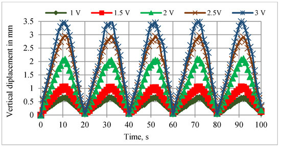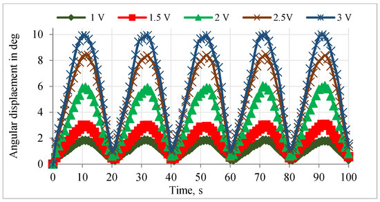 Experiments were conducted to actuate the mirror manipulator in the vertical and angular directions. The open-loop performances of the manipulator for different input voltages up to 3 V and frequencies (1/20, 1/10, 1/5, 1/3, and 1/2 Hz frequencies with 3 V amplitude) were evaluated using the experimental setup as shown in Figure 3, and the results are listed in Table 2 and Table 3. The findings proved that the designed mirror manipulator could move the mirror 3.4 mm vertically and 10.8 deg angularly for a maximum input voltage of 3 V. The following operating conditions were observed for the efficient use of the mirror manipulator: a maximum vertical displacement of 3.39 mm was obtained to an operating frequency of 0.05 Hz, and a displacement of 0.99 mm was obtained for a maximum frequency of 0.5 Hz. Likewise, a maximum angular displacement of 9.7 deg was obtained to an operating frequency of 0.05 Hz, and a displacement of 2.6 deg was obtained for a maximum frequency of 0.5 Hz.
