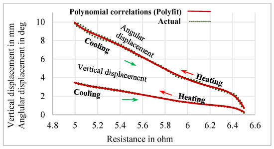 Using the Polyfit function in MATLAB® 2019, two different polynomial correlations were obtained to estimate the vertical and angular displacements of the mirror using the resistance variation of the SMPIC. The seventh-order polynomial and polynomial correlation between the vertical displacement of the mirror and resistance of the SMPIC are given by the following equations: