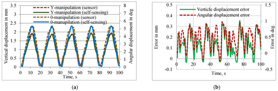 Validation of self-sensing with measured data using the external sensor. (a) Vertical and angular displacements. (b) Errors associated with displacements.