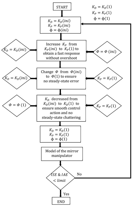 Two PD-VSC controllers were designed for Y and θ manipulation control, and the control parameters of the controller were obtained analytically using the MATLAB®/SIMULINK by adapting the procedure according to the flowchart in Figure 10 using the model developed from the system identification in Equations (4) and (5). By using this control parameter, real-time experiments were conducted to examine the controlled operation of mirror manipulator with the PD-VSC.