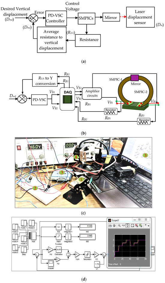 Control scheme of the SMPIC actuated and sensed mirror manipulator. (a) Block diagram. (b) Schematic representation. (c) Photograph: 1. Mirror manipulator, 2. Amplifier circuits, 3. DAQ, 4. Laser Displacement Sensor, 5. Control circuit in MATLAB®. (d) MATLAB® simulation block for control of the mirror manipulator.