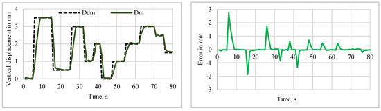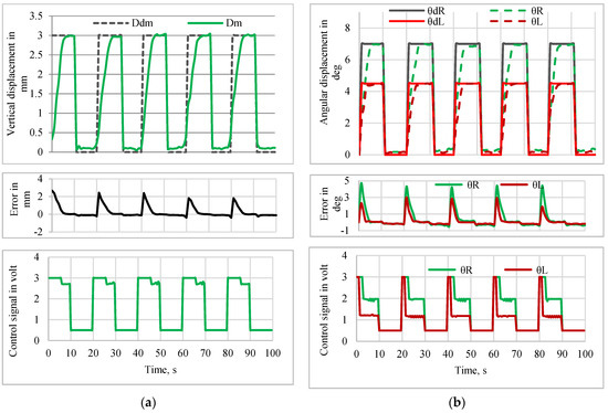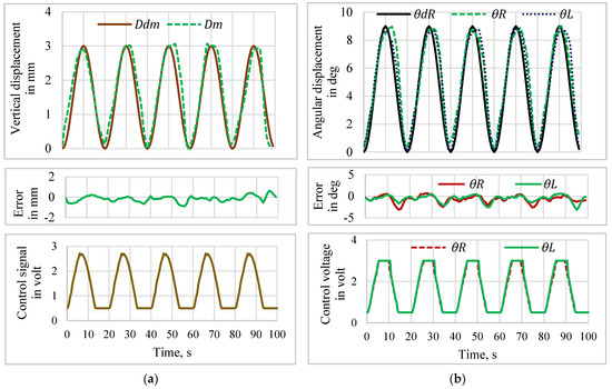 The tracking performance of the manipulator using the PD-VSC control system for tracking with a pulse, sine wave, and multistep inputs was experimentally verified. A pulse trajectory of amplitude 3 mm with a 50% duty cycle having an action period of 20 s was given as the desired input (Ddm) to a sensor-less closed-loop control system for the Y manipulation control of the mirror manipulator. The control action was executed in MATLAB®, and the controlled voltage developed by the PD-VSC controller was the input to both SMPICs that measured the corresponding vertical displacement (Dm). Figure 16a shows the position tracking performance, error, and respective control action for the Y manipulation control. The position tracking performance, error, and respective control action for the θ manipulation control, while tracking a pulse trajectory of amplitude of 7 deg for the right angle direction (θR) and 5 deg for the left angle direction (θL) with a 50% duty cycle and an action period of 20 s, are as shown in Figure 16b.