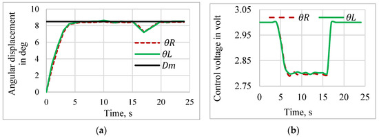 The disturbance rejection performance was evaluated for the left- and right-angle displacements. The desired step signal with an 8.5 deg amplitude was given to the proposed controller with a disturbance of a 50 mg load added to the bottom of the mirror after 15 s of actuation. Figure 20 shows the disturbance rejection behavior and the respective control action. The proposed controller showed high accuracy and smooth control action in the disturbance rejection activities. According to the proposed self-sensing-based PD-VSC’s closed-loop performances, depicted in Figure 14, Figure 15, Figure 16, Figure 17, Figure 18, Figure 19 and Figure 20, the PD-VSC could track the position and overcome the disturbances faster with no overshoot and without a steady state error.