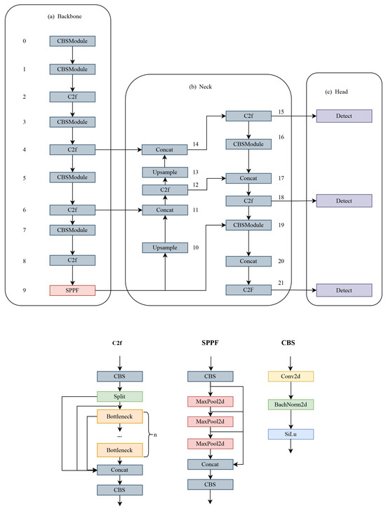 There are five different models of YOLOv8—YOLOv8n, YOLOv8s, YOLOv8m, YOLOv8l—and YOLOv8x, and as the model size increases, the detection accuracy increases. The network structure of the model consists of three main components: the backbone, neck, and head. The network structure is shown in Figure 1, the numbers in the figure indicate the layers of the model.