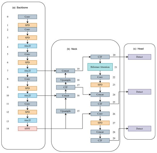 SPD-Conv consists of two parts: a space-to-depth (SPD) layer and a non-strided convolution. First, the SPD part applies the original image transformation technique [23] extension within the neural network to downsample the feature maps and then undergoes a non-strided convolution (stride = 1) to further transform the feature maps. SPD downsamples the original feature map X by slicing it into multiple sub-feature maps and connecting them along the channel dimension to form . Each sub-feature map is a subset of the original feature map with some degree of downsampling. After the SPD feature transformation layer, the downsampled feature maps are further transformed into by adding a non-strided convolutional layer to reduce the channel dimension and extract more discriminative feature information. This approach helps to reduce the computational burden and accelerate the processing speed of the network while preserving important information. In this paper, we replace the strided convolution in the CBS module of the original model with non-strided convolution, using SPD in conjunction with non-strided convolution to adjust the network structure, minimizing the feature loss of UAV targets and retaining more shallow semantic information.