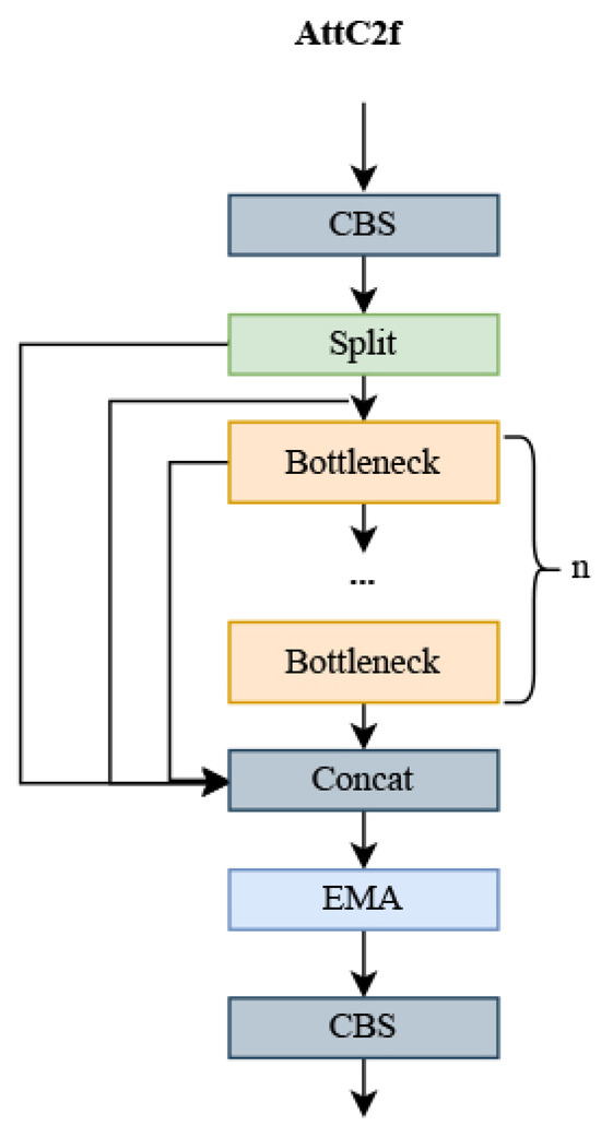 Using a cross-space learning approach, the EMA module can model long-range dependencies and embed precise positional information from the UAV. By fusing contextual information at different scales, the CNN can produce better pixel-level attention for high-level feature maps. Contextual information between intermediate features is better exploited by using and convolutions in parallel to more efficiently model short-range and long-range dependencies for improved performance compared to incremental behavior with gradually formed finite sensory fields. This allows the model to use less computation while focusing more on UAV characteristics. In this paper, we introduce the proposed AttC2f module into the backbone network, replacing four of the C2f modules, to fully exploit this module.