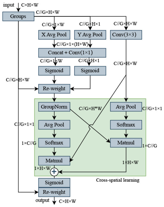Feature grouping: The EMA module divides the input feature map X into multiple cross-channel dimensional sub-features G by channel grouping, where the groups can be represented as , where denotes the ith sub-feature, each of which is used to learn different semantic information. This helps the model to better understand the relationship between the different channels in the input feature map and allows the learned attention weights to fine-tune the feature representation of the region of interest in each sub-feature.