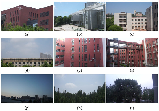 Partial presentation of the Anti-UAV dataset includes: (a–c) daytime with building background; (d–f) daytime with complex building background; (g) evening with open background; (h,i) outdoor with complex background.