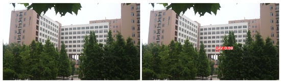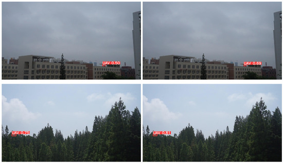 The detection of small UAV targets in complex backgrounds is particularly challenging, as these targets are highly susceptible to being missed when their colors blend with the environment, but the algorithm proposed in this paper effectively mitigates these problems, as shown in the reasoning results in Figure 7, in (a), the YOLOv8s algorithm experiences false detections and misses when detecting drones and small targets of drones in complex backgrounds, while in (b), the algorithm proposed in this paper accurately detects drones in complex backgrounds and can reduce the miss detection of small UAV targets. Furthermore, as shown in Figure 8, the YOLOv8s reasoning result in (a) and the reasoning result (b) of the algorithm proposed in this paper demonstrate that the confidence level for UAV detection is significantly improved with the proposed algorithm.