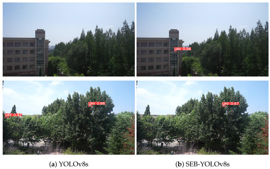 Inference results of the original model and the method proposed in this paper for UAV target detection. (a) Inference results of YOLOv8s; (b) inference results of the proposed algorithm SEB-YOLOv8s in this paper.
