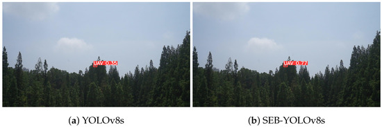 Inference results of YOLOv8s and the proposed algorithm SEB-YOLOvs on the Anti-UAV dataset. (a) Inference results of YOLOv8s; (b) Inference results of the proposed algorithm SEB-YOLOv8s in this paper.
