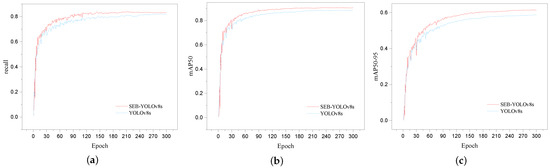 (a) Training curves of SEB-YOLOv8s and YOLOv8s in the recall; (b) training curves of SEB-YOLOv8s and YOLOv8s in mAP50; (c) training curves of SEB-YOLOv8s and YOLOv8s in mAP50-95.