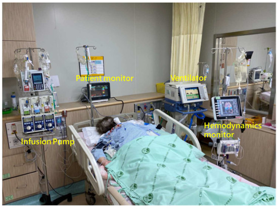 As the world approaches an aging society which will be reached by 2050 [1], Artificial Intelligence of Things (AIoT) integration is essential for enhancing medical technologies. Currently, over 62% of medical devices are wearable or implantable [2,3], aimed at home or sub-health monitoring. The remaining 38% are primarily used in Intensive Care Units (ICUs) [2,4], an area with less focus on AI application. In hospitals, a significant portion of critical medical devices, including patient monitors, ventilators, infusion pumps, and hemodynamics monitors, are deployed in ICU settings. This is demonstrated in Figure 1, which shows an ICU example. This reflects the need for advanced AIoT solutions in ICUs to aid healthcare providers in managing the increasing demands of patient care in these critical environments.