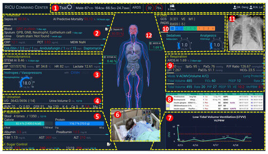 The AI interpretation results (Figure 4(12)) display the current AI inference results, including ARDS prediction, sepsis prediction, STEMI detection, etc., to be elaborated upon in Section 4.3. The screen also includes the key parameters of the hemodynamic monitor (Figure 4(3)), the key parameters of the urinary system (Figure 4(4)), and the nutritional status (Figure 4(5)). The screen also includes a body map (Figure 4(12)) that displays alarms and extreme abnormal test results regarding patient’s organs. The screen also includes the key parameters of the ventilator (Figure 4(9)), such as Vt, Ve, FiO2, and PBW, which are used to compute Equations (1)~(3). The screen also includes the infusion pump status (Figure 4(10)). The Picture Archiving and Communication System (PACS; Figure 4(11)) displays the most recent medical images.