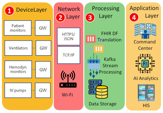 The medical crew at CMUH-RICU obtains information through a main panel interfaced by the command center, which is a critical part of CMUH-RICU. The medical data paths supporting user access requirements are structured into four layers as per the reference model [19,20], as depicted in Figure 5: