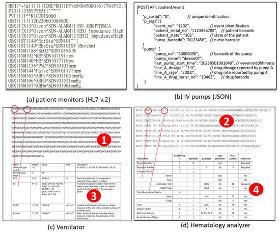 In the CMUH-RICU, medical devices use various data formats, including standard formats like Health Level Seven International (HL7) v2 [21] for patient monitors (Figure 6a) and JavaScript Object Notation (JSON) for infusion pumps (Figure 6b), as well as proprietary formats for ventilators (Figure 6c), hematology analyzers (Figure 6d), and hemodynamics monitors (Figure 7a). These proprietary formats, consisting of custom codes and values (e.g., Figure 6(1,2) and Figure 7(1)), require decoding based on the manufacturers’ technical documentation (e.g., Figure 6(3,4) and Figure 7(2)).