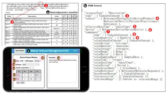 FHIR utilizes a Representational State Transfer (RESTful) Application Programming Interface (API), enabling easy deployment and supporting information exchange in various formats like JSON and Extensible Markup Language (XML). Taiwan’s Ministry of Health and Welfare endorses HL7 FHIR for its streamlined exchange process, leading CMUH-RICU to adopt FHIR as the standard data format. Medical device data are converted to FHIR via a translation mechanism in the processing layer (Figure 5(3)), using a web-based Graphical User Interface (GUI) for device feature management (DFM; Figure 7c) [25].