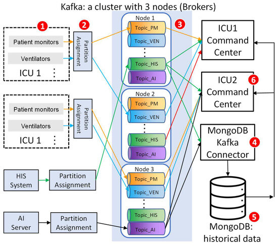 MongoDB stores historical medical data (Figure 8(5)), which is accessible to the ICU command centers for analysis. The MongoDB Kafka Connector (Figure 8(4)) facilitates the transfer of data from Kafka to MongoDB, with each medical device category’s data stored in a MongoDB collection. Historical data are retrieved by filtering based on patient ID and location, similar to real-time data access.