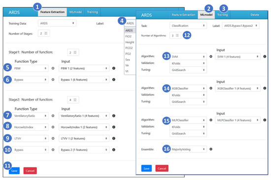 CMUH-RICU leverages a no-code low-code (NCLC) machine learning platform known as AItalk [30] (Figure 9) for the development of its AI applications. This platform allows medical experts to define feature extraction processes and machine learning models via a web-based GUI. As depicted in Figure 9, the ARDS AI application interface includes three buttons on a blue banner for setting up feature extraction (Figure 9(1)), machine learning models (MLmodel; Figure 9(2)), and training (Figure 9(3)).