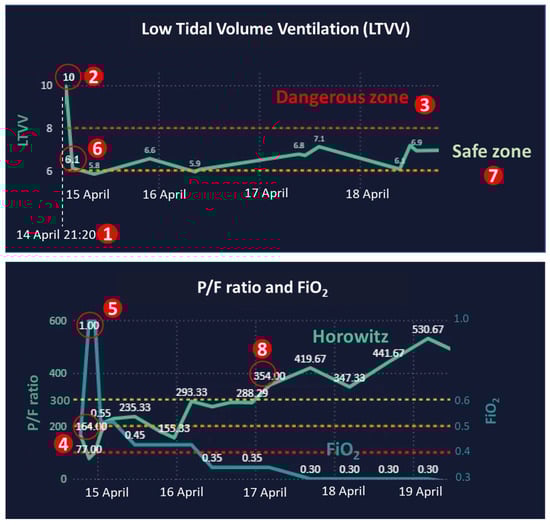 On 14 April at 21:20 (Figure 10(1)), the patient was diagnosed with ARDS with the assistance of ARDS AI prediction; his LTVV was 10 (Figure 10(2)), which is higher than 8, the maximum safe LTVV value (Figure 10(3)). The P/F ratio was 164 (Figure 10(4)), which is lower than 300, the minimum safe value. Additionally, the FiO2 was 1.0 (Figure 10(5)), exceeding the safe value, which must be lower than 0.4. Upon receipt of the alert from the command center, the critical care team, composed of intensivists, cardiac surgeons, respiratory therapists, nurses, pharmacists, and nutritionists, worked together to provide care. Coupled with an effective treatment regimen of specific antibiotics and antivirals, the patient’s condition showed significant improvement within 6 h. On 15 April at 03:30, his LTVV value decreased to 6.1 (Figure 10(6)), and it continued to remain within the safe zone (Figure 10(7)). Additionally, his P/F ratio and FiO2 showed improvement, both falling within the safe range on 17 April (Figure 10(8)). Following a two-week hospitalization, he made a complete recovery and was discharged successfully.