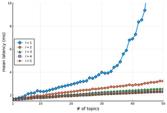 The net data flow rate of these five topics is 65.66 Mbps, requiring a net storage capacity of 22 TB per year. Based on the above workload, Figure 11 plots the expected delay time of the Kafka data path when the cluster has nodes ( and the number of topics increases from 1 to 50. The figure demonstrates the advantage of load balancing, where the delay decreases as increases. In the current implementation, we select to process five topics with an expected delay of 1.72 ms. It can also handle up to 50 topics with an expected delay of 2.57 ms.