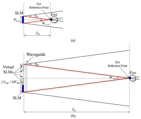 In a typical holographic system, the optimal observation distance is determined by the focal length of the eye-piece lens placed in front of the SLM. In contrast, in a lensless holographic system, the optimal observation distance is determined by the characteristics of the SLM. In particular, the farther the observation distance is from the optimal observation distance, the smaller the FOV becomes. Therefore, to formalize the expansion of FOV in our previous paper, FOV is a function of observation distance, and in this section, FOV is specified as the maximum FOV to derive the optimal observation distance. Alternatively, virtual SLMs generated through the pupil replication process enlarge the system’s exit pupil, positioning the eye reference point at a greater distance from the physical location of the SLM. Figure 2 shows the definition of the optimal observation distance providing maximum FOV in a lensless holographic system. Here, we focus on the one-dimensional case, as virtual SLMs are generated in the horizontal direction. Figure 2a depicts the principle of encompassing the maximum FOV at an optimal observation distance through the complete utilization of the bandwidth capacity of a single SLM. The SLM modulates the wavefront of an incident plane wave within the maximum diffraction angle range defined by . Here, is the wavelength of the laser light source, and is the pixel pitch of the SLM. When the viewer moves away from the designated observation location, the bandwidth for object reconstruction diminishes, causing part of the image to become invisible and a reduction in the FOV. This issue originates from the limited diffraction angle and the size of the SLM. Figure 2b presents a waveguide-based holographic system utilizing a waveguide to create an array of multiple virtual SLMs. This planar array of virtual SLMs enhances the freedom of the optimal observation distance by enlarging the aggregate size of the SLM while maintaining the same diffraction angle. The optimal observation distance , at which a viewer can observe the entire holographic image with the maximum FOV, can be calculated from the following: