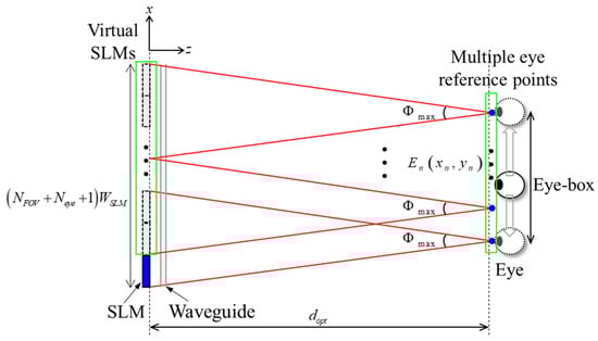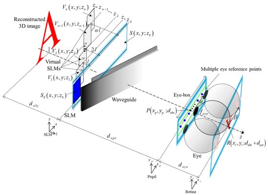 From the mathematical relationship between the wavefield in the SLM plane and the wavefield in the retinal plane of the eye, the CGH is calculated by ICdFr, while the numerical observation simulation is performed by CdFr. In order to perform accurate observation simulation in the proposed system, it is necessary to obtain complex wavefield implemented in the SLM plane. The CGH pattern calculated in Equation (A6) and uploaded to the real SLM is formed repeatedly in the horizontal direction by the pupil replication process of the waveguide. Repetitive CGH patterns are created at the location where the virtual SLMs are formed, and the duplicated CGH patterns are propagated from the virtual SLM plane to the SLM plane. The entire wave field in the SLM plane, , is calculated as follows:
