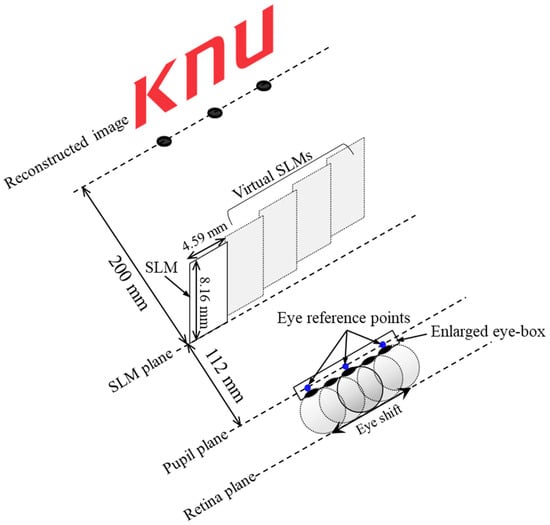Figure 5 displays a numerical observation simulation to reconstruct an image of finite depth within an extended eye-box by applying the proposed algorithm. The CGH generated by Equation (A6) is numerically observed at the retina plane by Equations (5) and (6). In this simulation, the waveguide is optically replaced by four virtual SLM replicas, which create three eye reference points at the pupil plane. At an optimal observation distance of 112 mm set by Equation (1), this configuration allows an image to be reconstructed at a finite depth with maximum FOV within the extended eye-box. The reconstructed image with a depth of 200 mm is the Kyungpook National University logo composed of the letters “K”, “N”, and “U”. The detailed parameters used in the simulation are listed in Table 1.