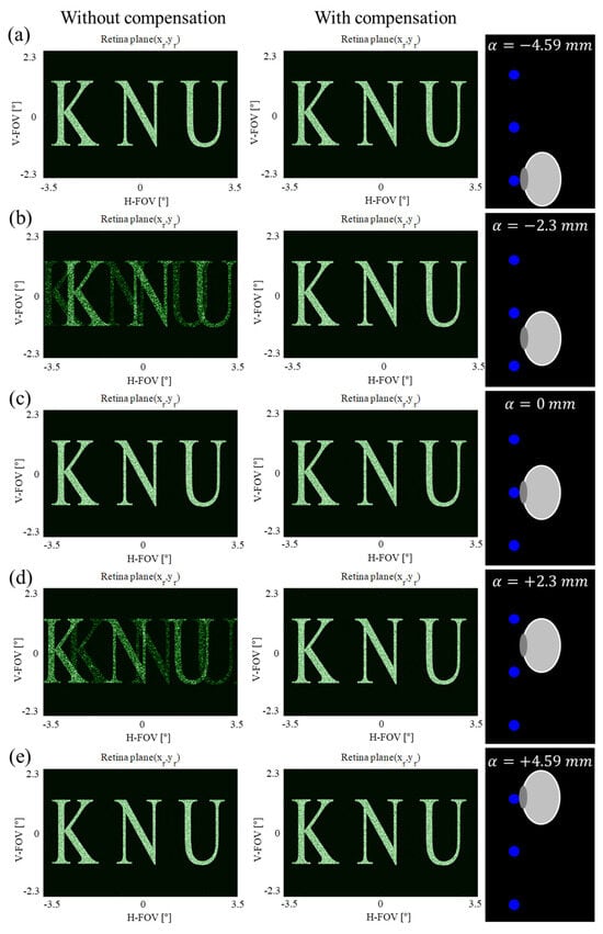 Numerical observation simulation results obtained without compensation (first column) and with compensation using eye tracking technology (second column) for shifted eye positions within the extended eye-box: (a) , (b) , (c) , (d) , and (e) .