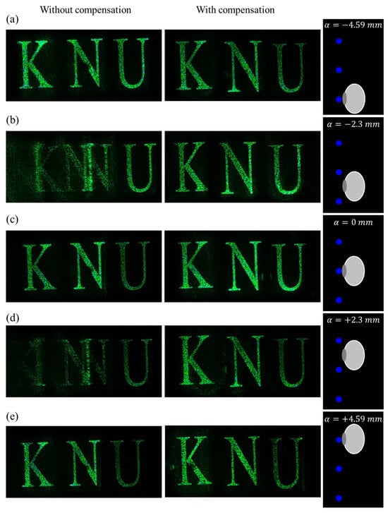 Optical experiment results captured without compensation (first column) and with compensation using eye tracking technology (second column) for shifted eye positions within the extended eye-box: (a) , (b) , (c) , (d) , and (e) .