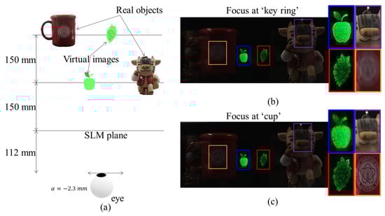 AR technology indeed overlays digital content onto the real world to enhance the user’s perceptions of and interactions with the environment. We performed additional experiments incorporating augmented reality, utilizing a combiner between a waveguide and a camera to concurrently capture both real objects and virtual 3D contents. Figure 9 shows the experimental results of the AR application. In this experiment, we employed the depth-map CGH to simultaneously reconstruct holographic images at multiple depths, as indicated in Figure 9a. Among the virtual contents, an apple was reconstructed at a distance of 150 mm from the SLM, while a grape was reconstructed at a distance of 300 mm from the SLM. Two types of real objects were prepared, a key ring and cup, each located at the same depth as the virtual contents. Figure 9b shows a photo captured when the camera was focused on a near object, i.e., a keyring, and Figure 9c shows a photo captured when the camera was focused on a far object, i.e., a cup. Pictures were captured at a position shifted by −2.3 mm from the center within the expanded eye-box. As shown in Figure 9b, when focusing on a position 150 mm away from the SLM plane, one of the real objects, a key ring, and a virtual image, an apple, are in focus, and the rest appear blurred. In Figure 9c, when focusing on a position 300 mm away from the SLM plane, another real object, a cup, and the remaining virtual object, a grape, are in focus and the rest are out of focus. The results of this experiment indicate that the AR function works effectively by solving visual perception problems caused by depth mismatch between real scenes and virtual content.