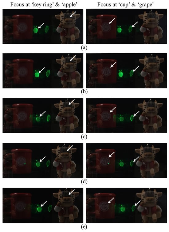 Experimental results of AR application at different pupil positions: (a) , (b) , (c) , (d) , and (e) . Note that the arrows indicate that the virtual content or real object the camera is focused on.