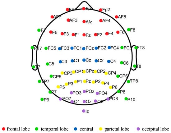 The raw EEG data were first preprocessed using the EEGLAB toolkit, and for the convenience of subsequent analyses, the electrodes with poor signals (PO4, O2, PO8, P10, TP8, F6, FP2, FPz, POz, P2, P1, PO3) were excluded from the EEG signals of all subjects, so that 52 valid channels were retained. The signals were filtered with a 0.5–45 Hz band-pass filter and a 49–51 Hz notch filter to eliminate power frequency interference. Then, the sampling frequency was reduced to 1024 Hz, and the whole brain average was used for re-reference. Finally, artifacts such as EMG and EOG were eliminated through independent component analysis (ICA). Then, the EEG signals of 25 subjects after pretreatment were divided into frequency bands: delta band (0.5–4 Hz), theta band (4–8 Hz), alpha band (8–14 Hz), beta band (15–30 Hz), gamma band (30–45 Hz), and full band (0.5–45 Hz).
