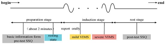 The whole VIMS induction experiment is divided into the preparation stage, induction stage, and the rest stage, and the experimental flow is illustrated in Figure 2. During the preparation stage, the participants were briefed on the whole experimental process and precautions, and signed the informed consent. Subsequently, the subjects filled out the basic information form and the pre-test SSQ (Simulator Sickness Questionnaire). The SSQ scale is used as a subjective measurement of virtual reality motion sickness. It is a motion sickness assessment scale [30] developed by researcher Kennedy and others based on a series of experiments. Its validity and reliability have been established and used in many related studies. The scale requires subjects to fill out the questionnaire based on their true feelings at the time of the experiment, and the results of the questionnaire are be used as a benchmark for visually induced motion sickness. The questionnaire consists of 16 different symptoms, each of which is categorized into 4 levels of symptom degree: none, mild, moderate, and severe; and 3 measured weight values for ocular discomfort: oculomotor (O), disorientation (D), and nausea (N). The weights of these symptoms can be used to calculate the final score of the SSQ.
