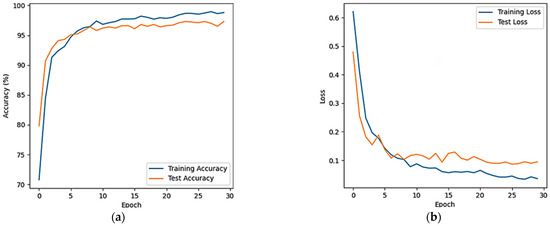 As can be seen in Figure 7a, the average accuracy increases dramatically from 1 to 10 epochs on both the training and test sets, and then levels off. The average accuracy on the test set finally stabilizes at around 95%. In Figure 7b, it can be seen that the average loss rate decreases sharply from 1 to 10 epochs, and finally stabilizes at around 0.1% on the test set.