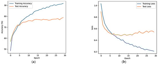 From Figure 8, it is evident that the average accuracy on the training set steadily rises during the first 30 epochs, paralleled by a consistent decrease in the average loss rate. On the test set, the average accuracy experiences a sharp increase from 1 to 5 epochs, subsequently stabilizing around 80%, while the average loss rate eventually converges to approximately 0.5.