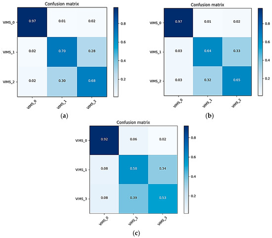 To further evaluate the performance of the three models SVM, CNN-2, and CNN-LSTM for VIMS triple classification, the average confusion matrices of the three models were computed on the full-band EEG signals of the 25 subjects and normalized to the confusion matrix, as shown in Figure 9. The sum of all probabilities in each row is 1, so the diagonal elements represent the recall of each category in turn.
