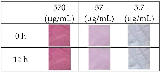 The indicator’s robustness in the presence of moisture stands as a critical feature that may shape its potential applications. In assessing the indicator’s interaction with the moisture, specimens were subjected to a nitrogen gas environment saturated with 100% humidity for 12 h. The stability of indicators impregnated with various concentrations of anthocyanin dye (570, 75, and 7.5 µm/mL) was compared. As seen in
