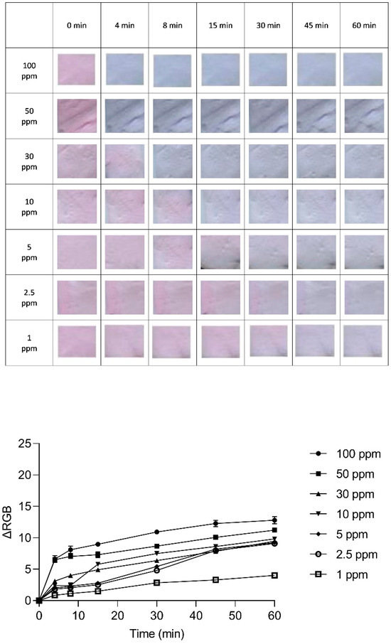 Figure 5, it can be observed how different concentrations of the dye affected the behavior of the indicators in response to varying levels of ammonia. When the dye concentration was high (570 µg/mL), it reached a point where the color change leveled off or became saturated at around 30 ppm of ammonia. This meant that increasing the concentration of ammonia beyond this point did not cause a significant change in the color of the indicator. On the other hand, when the dye concentrations were lower (57 µg/mL and 5.7 µg/mL), the color change leveled off at much lower concentrations of ammonia, specifically within the 1 ppm range. This is remarkable because it indicates that, at such low concentrations, the color change is discernible to the naked eye without requiring specialized equipment for detection.