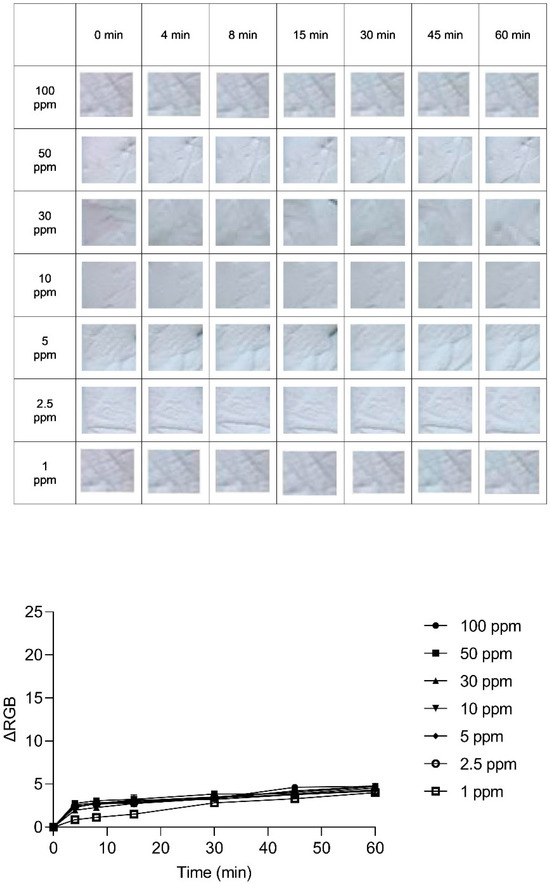 The steepness of these slopes reflects the sensitivity of the indicator to changes in ammonia concentration. When the slope is steeper, it means that even small changes in ammonia concentration caused significant changes in the color of the indicator. Thus, a steeper slope can be interpreted as an indication of the higher sensitivity of the indicator. By carefully adjusting the composition of the dye solution, it is possible to enhance the limit of detection of the indicator to below 1 ppm of ammonia. This demonstrates the potential for further refinement and optimization of the indicator’s sensitivity, which is crucial for detecting very low levels of ammonia accurately.