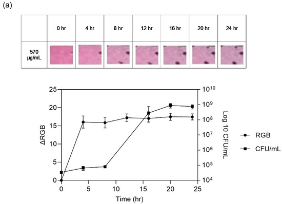 Figure 9 clearly demonstrates the findings, incorporating ∆RGB analysis, the optical appearance of the indicator, and subsequent bacterial growth evaluation, following exposure to 100 g of fresh beef. The alterations in the indicator’s color serve as a reliable approach of the presence of amine compounds, which emerge during meat spoilage due to bacterial growth. The expected outcome is that the color change becomes noticeable and reaches saturation before the meat is fully spoiled, as anticipated.