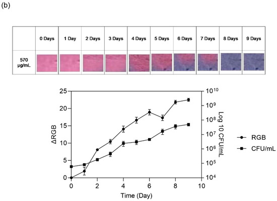 39]. Leveraging the sensitivity exhibited by the colorimetric platform, a dye concentration of 570 µg/mL was selected for the assessment of meat spoilage. To ascertain the spoilage progression in beef, an investigation was conducted over a 24 h duration under ambient conditions (23 °C) and over 9 days in the refrigerator at 4 °C. The indicator’s response was employed as a gauge of meat spoilage.
