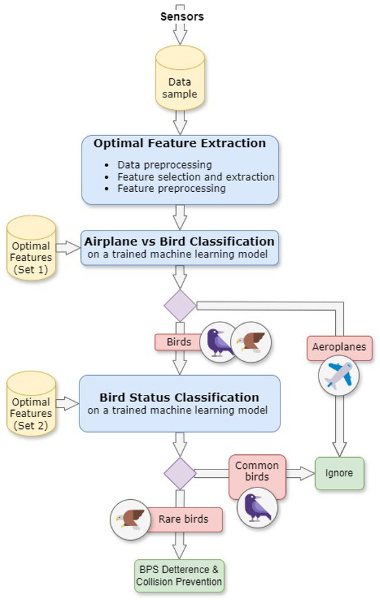 A block diagram of a real-time system for classifying aeroplanes, rare birds, and common birds.