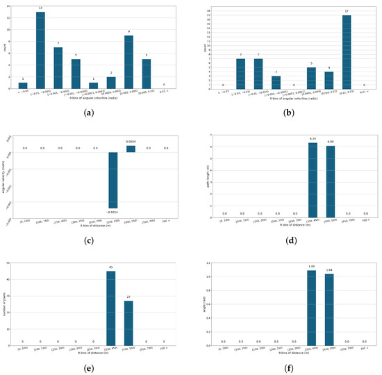 Figure 3. An example of feature extraction from preprocessed data, based on flight trajectory from Figure 2. (a) Histogram for angular velocity . (b) Histogram for angular velocity . (c) Average angular velocity per distance. (d) Average arc path lengths in per distance. (e) Average number of image pixels () of the detected object per distance. (f) Average polar angle per distance. - 2.